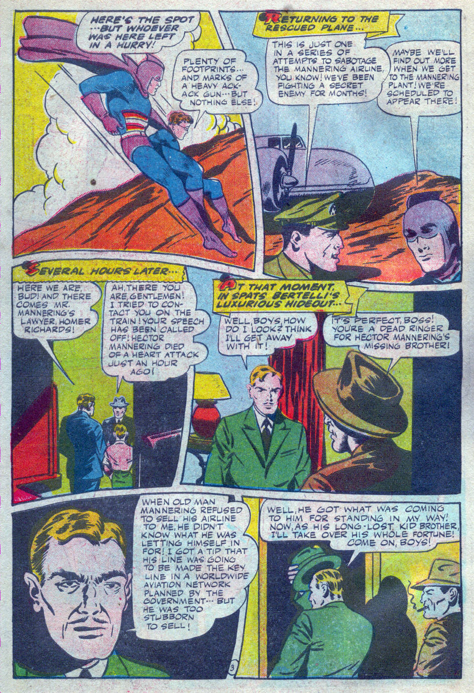 There is no specific title credited for this story from Exciting Comics #46 (Apr.1946) starring The American Eagle and his sidekick, Eaglet, so I've decided to call it "The Post-War Peril". The artist is also unidentified in the GCD.