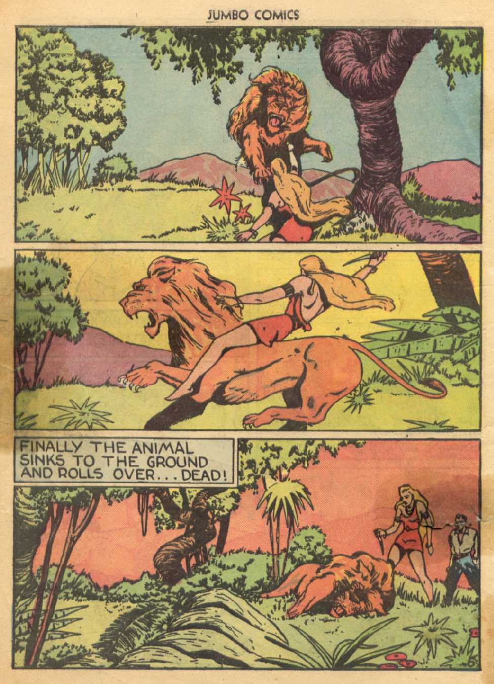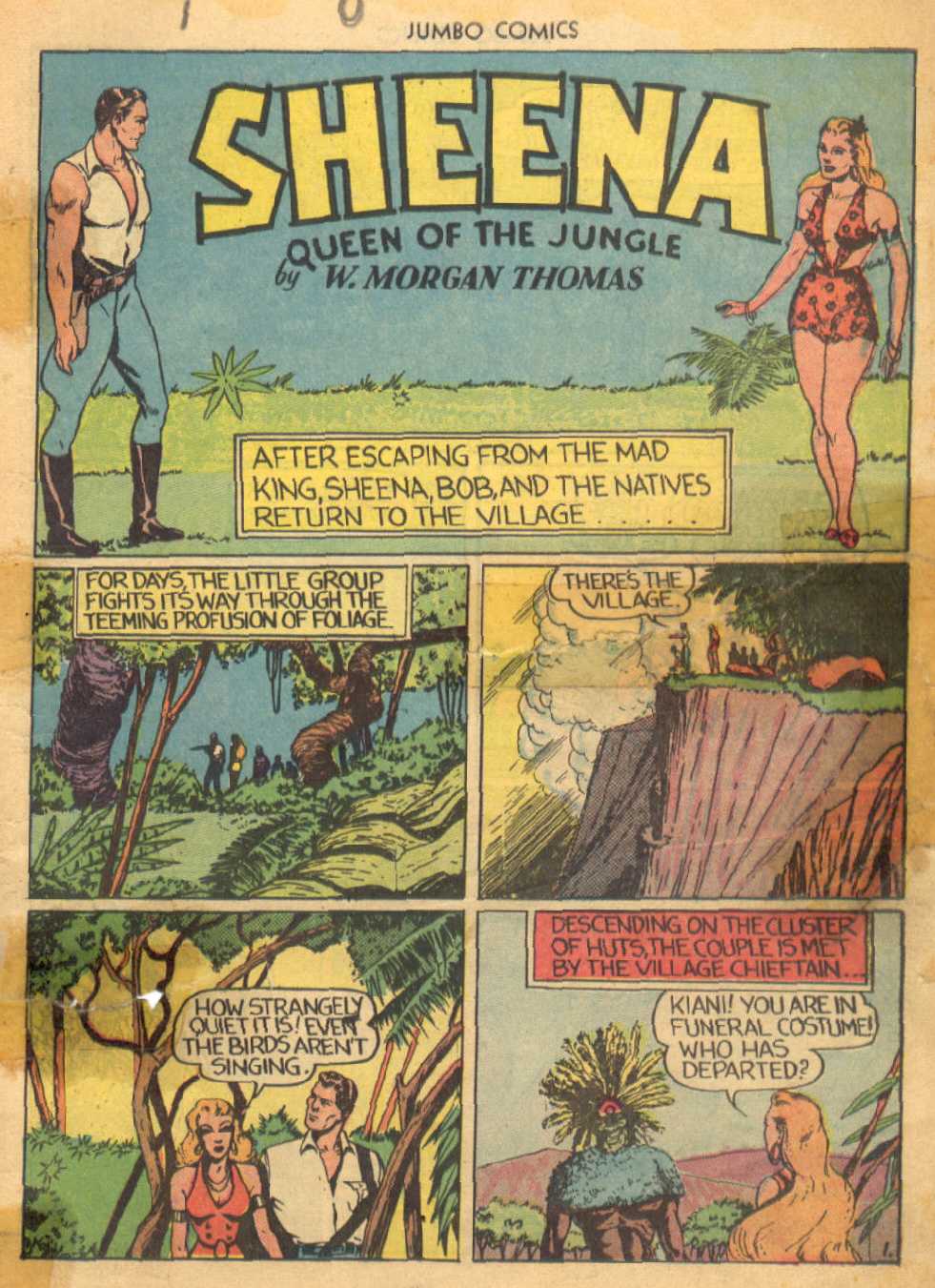 Friends, I'm going out of sequence this week with my "Top 10 Defunct Comic Book Publishers" series (which will shift to tomorrow), and serving up a special treat. Here is the golden age story that shows how Sheena, Queen of the Jungle first came to adopt her signature outfit. The untitled story that I've christened "The Skin of Leeta" is from Jumbo Comics #10 (Oct-Nov.1939); originally published by Fiction House. The writing credit belongs to W. Morgan Thomas and the artwork is by Bob Powell, but also check out this issues neat pulpish, sci-fi cover by the great Lou Fine which I'm including as a bonus reward for enduring today's last minute switcheroo.