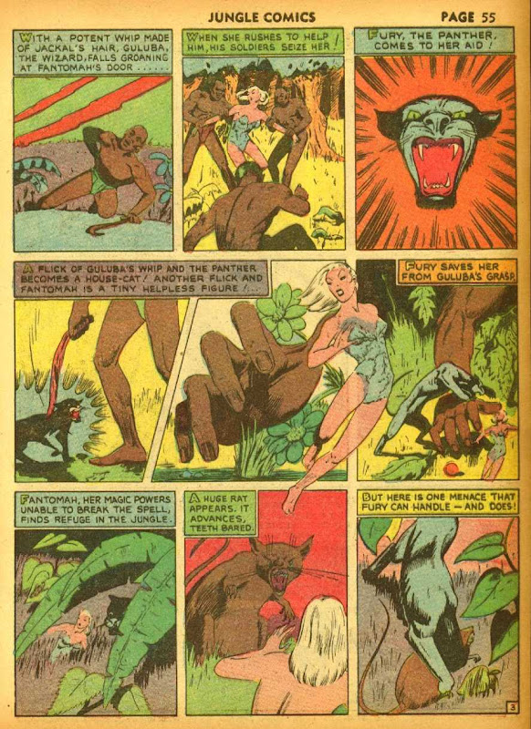 Although Fantomah later changed her appellation to "Daughter of the Pharaohs", in her earlier career role she was referred to as "The Mystery Woman of the Jungle". It is in that capacity that she stars today in a previously untitled story from Jungle Comics #19 (Jul.1941); originally published by Fiction House, that I'm calling "Fury and the Vengeful Wizard". This tale was written by ['W.B. Hovious'] and illustrated by Richard Case. There is some interesting juju action going on here, and apparently size really doesn't matter, at least as far as the outcome of this particular golden age classic. The Catacombs is grateful to Don "Zu-Gogo" Falkos for providing the scans for this story. Note: The copyright for this issue, its contents and artwork belongs to the original publisher and/or creators, and is reproduced here solely for entertainment purposes. Enjoy!