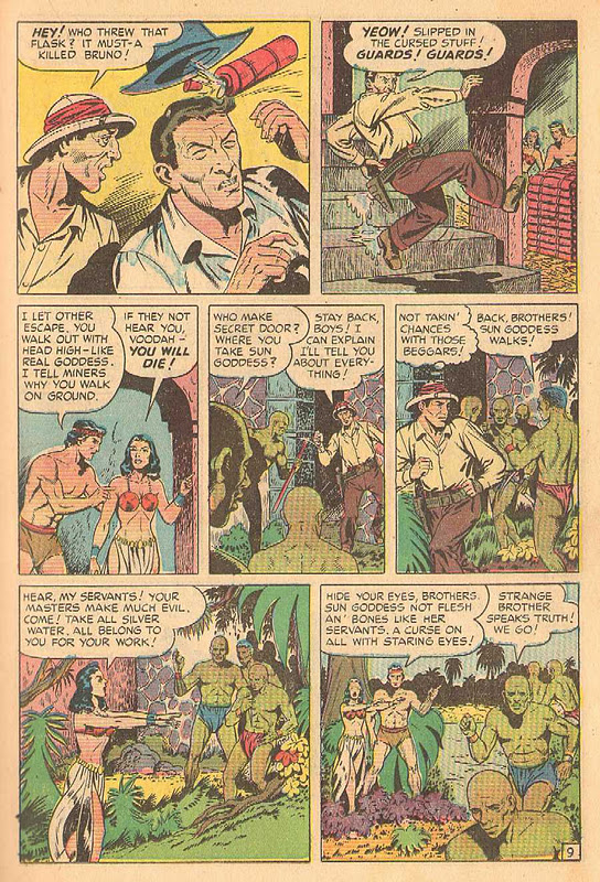 I have mentioned before that the golden age African warrior, Voodah, from Crown Comics was eventually altered by either the publisher, artists or colorists into just another white jungle lord in a loincloth. What the reasoning behind this transformation truly was is lost to the ages, but needless to say the forward thinking that had first allowed original creator Matt Baker to present a golden age black adventure hero had long since run its course. This previously untitled story that I’m calling “Shrine of the Sun Goddess” from Crown Comics #14 (Aug.1948); originally published by McCombs Publication, was drawn by artist Anthony Cataldo (with possible facial touch-ups by Ruben Moreira). The Catacombs is grateful to Don "Zu-Gogo" Falkos for providing the scans for this story. Note: The copyright for this issue, its contents and artwork belong to the original publisher and/or creators and is reproduced here solely for entertainment purposes. Enjoy!