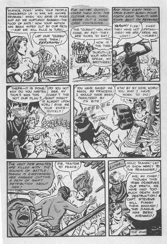 Today, Taanda stars in a black & white version of "The Ant Invasion!" reprinted in Jungle Girls/Wild Side #15 (1993); published by AC Comics. However the story was first presented in White Princess of the Jungle #3 (May 1952); originally published by Avon and with art credited to Gene Fawcette. The Catacombs is grateful to Don "Zu-Gogo" Falkos