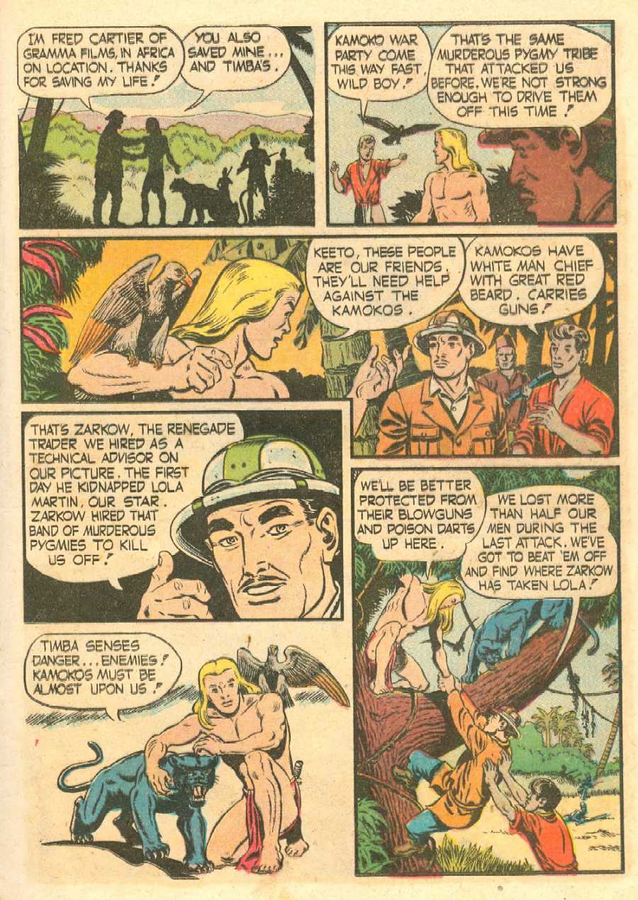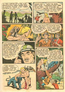 This short adventure called "Star of the Jungle" is from Wild Boy #11 [2] (Apr-May 1951); originally published by Ziff-Davis and with art by Paul Hodge. Watch Wild Boy elude the jaws of death (heck, it says so right on the front cover) as he aids a Hollywood film crew who've been captured by the villainous Zarkow, a renegade white trader, and his hostile pygmies. Wild Boy, his friend Keeto; his panther (Timba) and his falcon (Kaw) are all put to great task rescuing Fred Cartier and Lola Martin before the whole kit & caboodle can be sacrificed to the God known as Zemo.