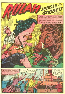 They say that absence makes the heart grow fonder, which rings false in regards to my ex-wife, but definitely proves true with the lovely Rulah Jungle Goddess. The jungle goddess has been away too long; my "ex", not long enough. This fun tale called "The Poison Sourswine" from Zoot Comics #16 (July.1948); was originally published by Fox Feature Syndicate, Inc. The GCD lists Matt Baker as artist, with a question mark; which brings into question whether he flew solo on this exciting tale, or did Jack Kamen lend a helping hand?