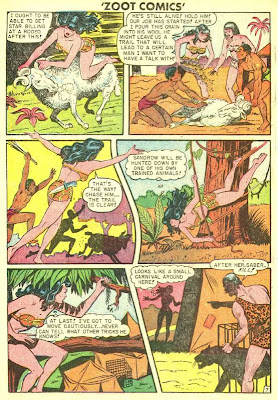 many dangers and sometimes he gets a bit testy about unwanted intrusions into his rustic home. In a previously untitled story that I've dubbed "The Whisper Chamber", Jan and his ape friend, Kaang, come to the aid of a beautiful princess in a golden age tale from Rangers Comics #46 (Apr.1949), originally published by Fiction House. The story is signed "Coleman Hart", but the